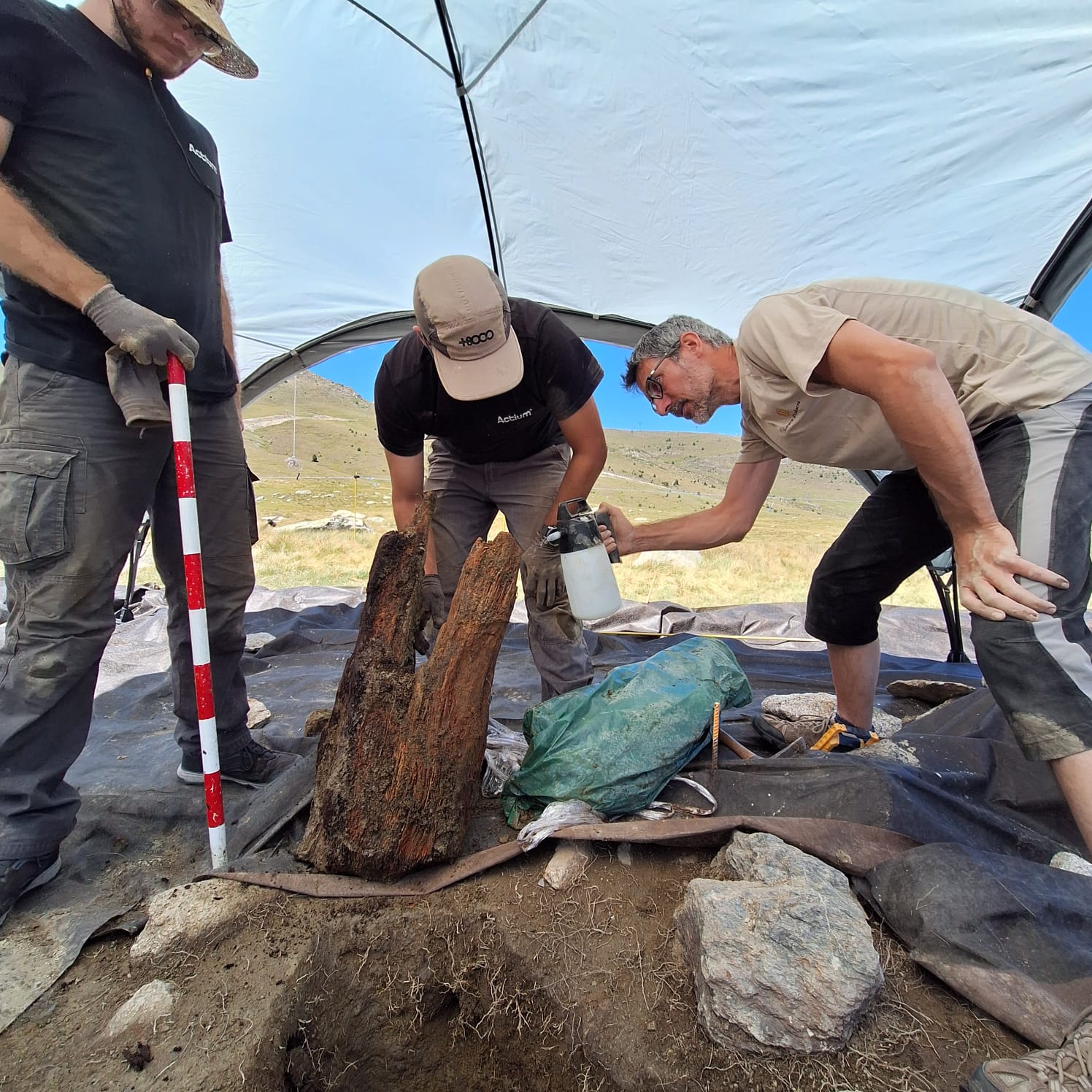 D’una banda, s’ha dut a terme l’excavació d’un forat al voltant del túmul (construït durant el neolític final, fa uns cinc mil anys, aproximadament), en el qual s’havien detectat restes de fusta no carbonitzada. La seva excavació ha permès recuperar les restes d’un pal de fusta, amb una llargada conservada d’uns 80 cm i un diàmetre proper als 40 cm.