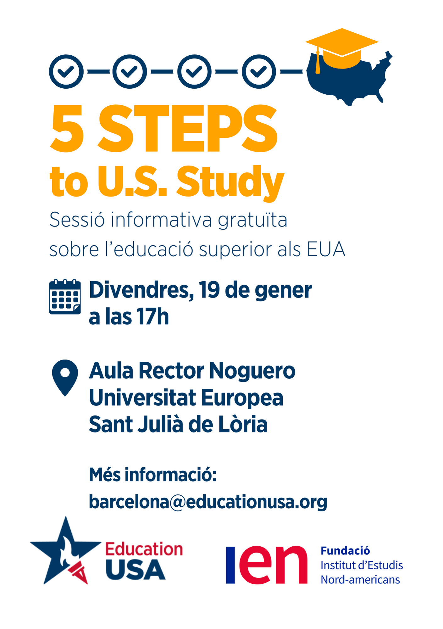 El dia 19 de gener a les 17h tindrà lloc a la Universitat Europea, a Sant Julià de Lòria, una sessió informativa sobre l'educació superior als Estats Units d'Amèrica a càrrec de la Sra. la Sarah Stearns, assessora acadèmica del servei EducationUSA