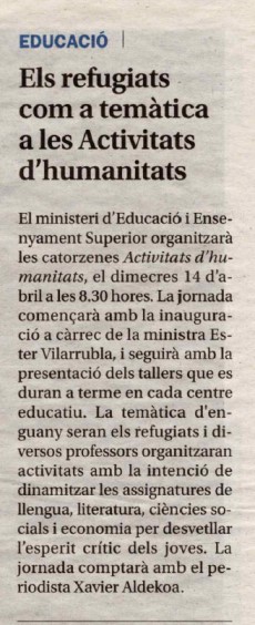 El Sr. Manuel Cruz impartirà també una altra conferència només pels alumnes i docents participants a les activitats d’humanitats a les 9.00 h al Centre de Formació Professional en el marc de les vuitenes activitats d’humanitats que tenen com a tema aquest any la llibertat. Professors de les diverses assignatures de llengua i literatura castellana i francesa, de llatí i grec, de filosofia i de ciències socials participen en l’organització de les activitats d’humanitats, que pretenen, d’una banda, dinamitzar les assignatures de llengua, literatura, ciències socials i filosofia, per desvetllar l’esperit crític dels joves i, d’altra banda, permetre a professors i alumnes de tots els sistemes educatius de treballar plegats, de compartir experiències educatives i de conviure durant tot un dia.