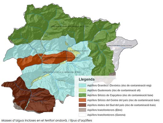 Durant els anys 2006 i 2007 s'ha elaborat l'estudi relatiu a les aigües subterrànies del Principat d'Andorra, a fi de definir i caracteritzar les masses i els cursos d'aigües subterrànies des de la perspectiva que defineix la Directiva europea Marc de l'Aigua 2000/60/CE.
